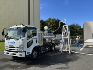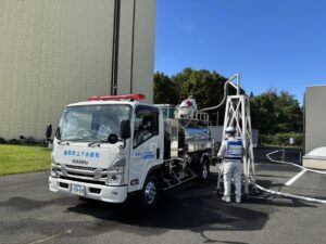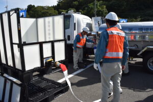 2日目は、外部からの応援を円滑に進めるため、関係団体の派遣職員および給水車の受入れ訓練と応急給水訓練を実施しました。