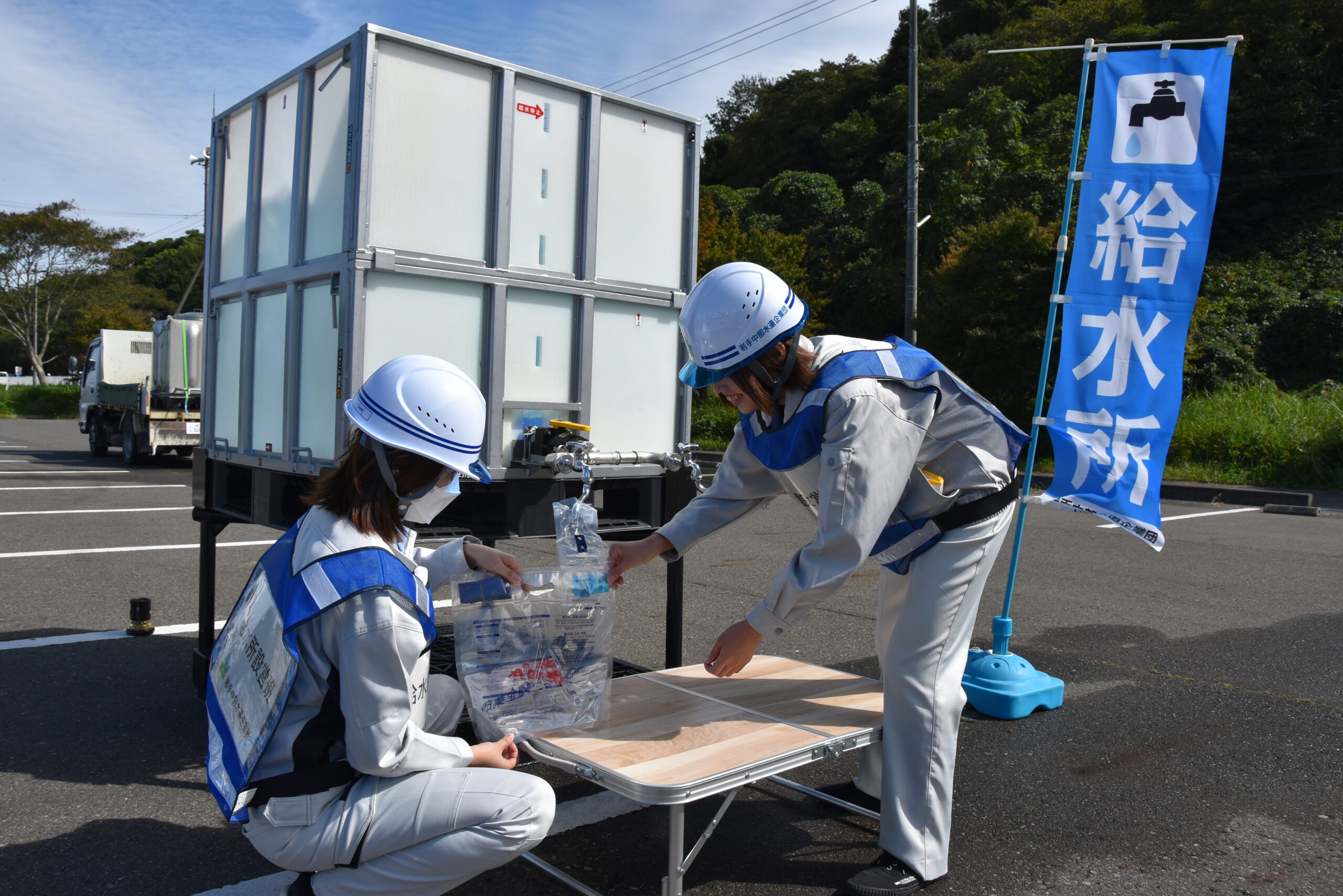 2日目は、外部からの応援を円滑に進めるため、関係団体の派遣職員および給水車の受入れ訓練と応急給水訓練を実施しました。