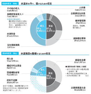 収益的収支(消費税抜)では、水道料金収入が47億3,319万円(対前年度比0.3%減)となり、事業収益は60億8,402万円となりました。一方、事業費用は61億2,375万円となり、差引3,973万円の純損失となりました。